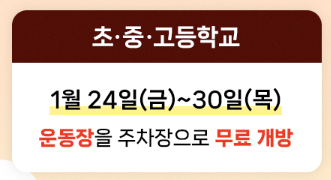 1)초·중·고등학교 운동장 개방: 1월 24일(금)부터 1월 30일(목)까지 전국의 초·중·고등학교 운동장이 임시 주차장으로 무료 개방됩니다.