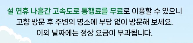 고향을 방문하는 길뿐 아니라 연휴 기간 동안 주변 명소를 방문할 계획이 있다면 이번 통행료 면제 혜택을 적극 활용해 보세요.