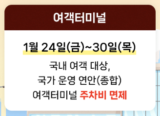 3)여객터미널 주차비 면제: 1월 24일(금)부터 1월 30일(목)까지 국가에서 운영하는 연안 여객터미널 주차비가 면제됩니다.