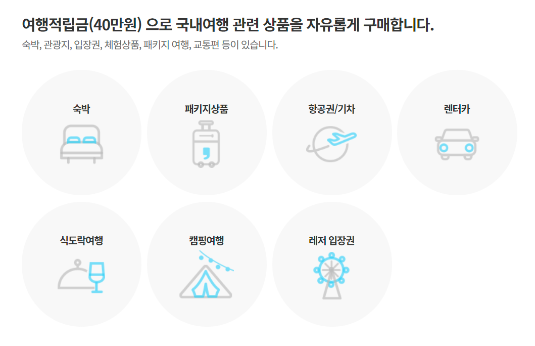 적립된 40만 원은 휴가샵 전용 플랫폼에서 국내 여행 상품(숙박, 교통, 관광지 입장권 등)을 구매하는 데 사용됩니다.