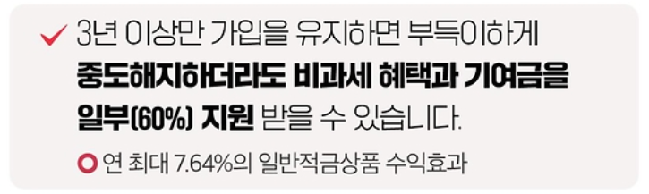 또한, 3년 이상 가입을 유지하면 부득이하게 중도 해지하더라도 비과세 혜택과 기여금의 일부(60%)를 지원받을 수 있습니다.