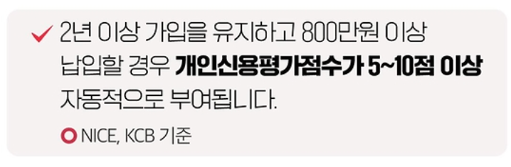 청년도약계좌를 2년 이상 유지하고 800만 원 이상 납입할 경우, 개인신용평가점수가 5~10점 자동으로 부여됩니다.
