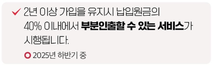 2025년 하반기 중에는 납입 원금의 40% 이내에서 부분 인출할 수 있는 서비스도 시행될 예정이어서, 청년들이 계좌를 보다 꾸준히 유지할 수 있도록 지원할 계획입니다.