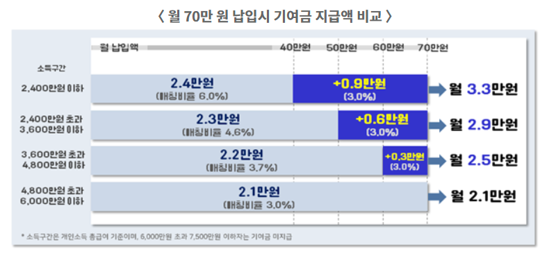 하지만 2025년 1월부터는 월 70만 원을 납입하면 매칭한도 확대 구간(월 40만~70만 원)에 대해 3.0%의 기여금을 추가로 받아 총 월 3.3만 원의 기여금을 받게 됩니다.