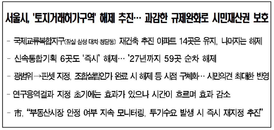다만, 특정 지역에서 투기적 거래가 발생할 가능성이 있는 만큼, 서울시는 시장 상황을 면밀히 모니터링하면서 추가적인 규제 조치를 검토할 예정입니다.