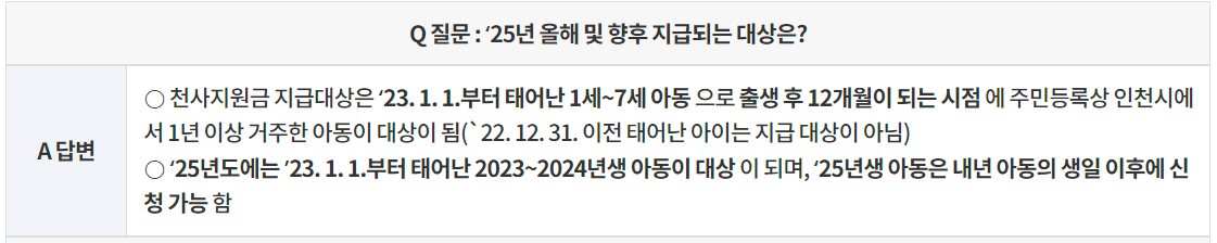 천사지원금은 단순한 경제적 지원을 넘어, 인천시에 거주하는 부모님들께 실질적인 도움을 주는 중요한 정책입니다. 1~7세까지 연 120만 원씩 지원된다는 점에서 부모님들의 부담을 덜어줄 뿐만 아니라, 인천시 내 소비 촉진에도 긍정적인 영향을 미칠 것으로 기대됩니다.
