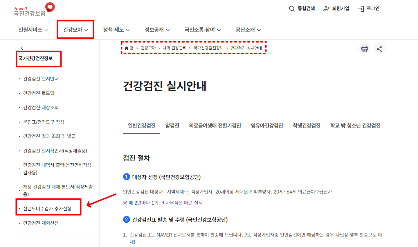 또한, 전년도에 검진을 받지 못한 경우에도 전년도 미수검자 추가 신청을 통해 대상자로 등록하고 검진을 받을 수 있습니다.
