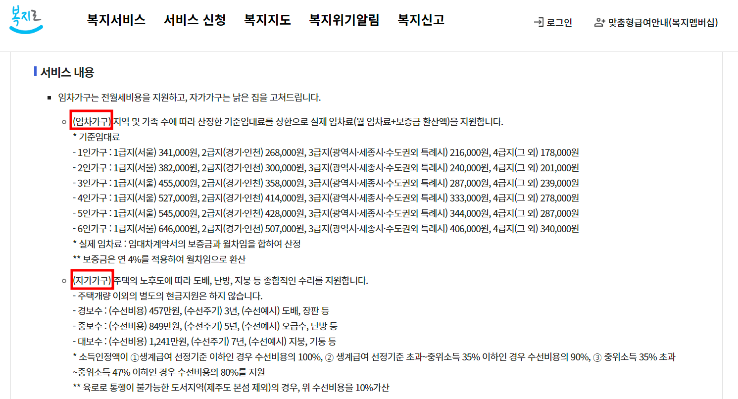 지역 및 가족 수에 따라 산정한 더 세부적인 지원 금액은 복지로 홈페이지>주거급여>서비스 내용 메뉴에서 확인할 수있습니다.
