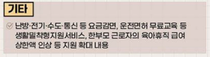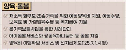 ▶아동양육비: 저소득 한부모가족 및 조손가족의 만 18세 미만 아동에게 1인당 월 20만 원의 급여가 지급됩니다.