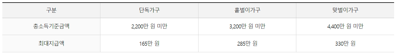 ▶단독 가구: 배우자나 부양가족이 없는 1인 가구로, 연 소득이 2,200만 원 이하일 경우 신청 가능