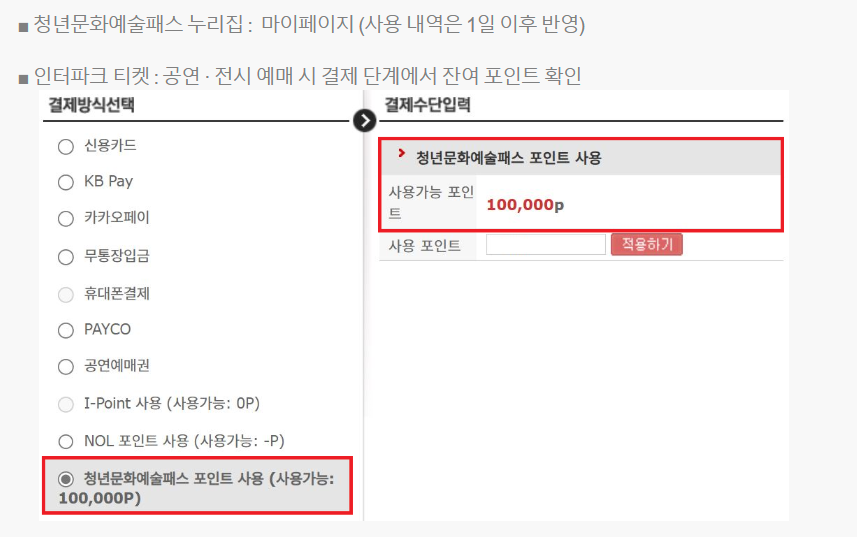 지원금을 받은 청년들은 온라인 예매 사이트에서 결제할 때 문화예술패스 포인트를 선택하면 됩니다. 또한 일부 국공립 공연장에서는 현장 예매 시에도 사용할 수 있습니다.