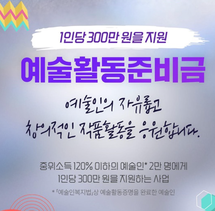 예술활동 준비금 지원사업은 경제적인 어려움으로 인해 창작활동을 지속하기 어려운 예술인을 대상으로 필요한 준비자금을 지원하는 제도입니다. 예술인복지법에 따라 예술활동증명을 완료한 예술인이 신청할 수 있으며, 연간 2만 명을 선정해 1인당 300만 원을 지급합니다.