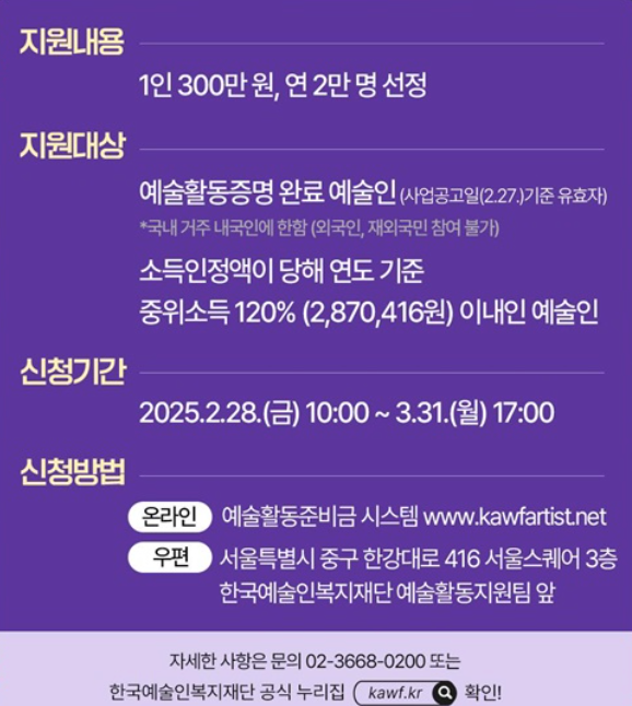 ▶사업 공고일(2025년 2월 27일) 기준으로 예술활동증명이 유효해야 합니다.
