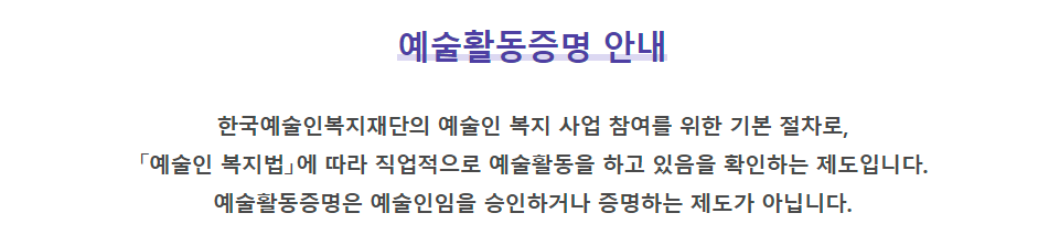 ▶예술활동증명은 한국예술인복지재단에서 운영하는 제도로, 일정 기준을 충족하는 예술인에게 발급됩니다.